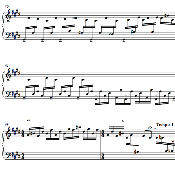 Formally, I modified the traditional Baroque suite by substituting a ballad for the courante and a waltz for the sarabande. Each movement celebrates a different aspect of Bach. The Prelude is the most like his music in terms of style and structure. It is built from a continuous series of arpeggiated chords, which move in both predictable and unexpected ways throughout the large-scale tonal structure. The Allemande is presented in a recitative style, expanding simple cadential formulas into virtuosic flourishes and transforming the regular rhythm of this dance into a dialog between contrasting styles and registers. The Ballad and the Waltz are companion pieces, sharing a motif and forming a complete motion through harmonic space. The Ballad exploits the beautiful sound of softly rolled chords, particularly well suited to the marimba. The Waltz, by contrast, is very pointed and dry, bursting with sly sarcasm. It proceeds, without stop, directly into the Gigue. In this final movement, the motives are quotes from Bach’s cello suites. They are piled together in the midst of constantly escalating momentum, hurtling together toward a virtuosic climax, which takes advantage of Brenton’s prodigious talent.